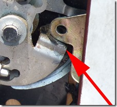 Above is an illustration of the door when it is locked…if you look at the red arrow, that little metal piece is to the left of the brass piece. When you try to open the door, it does not move the brass piece, and the door remains latched (shut).