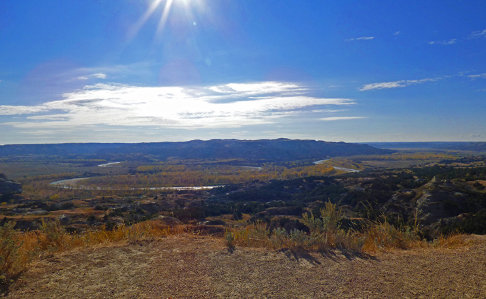 I take a right headed back to the RV Park 45 miles away through the construction...and I see this sign..."Entering Mountain Standard Time". WHAT? When did we leave MST? Then my phone changes time, the GPS changes time...we got our missing hour back. YES, we were having fun...but not enough to account for a missing hour. Who would have known that the Little Missouri River in this area was the boundary for the difference between Central and Mountain Time Zones...so in the park, the South Unit is on Mountain Time, the North Unit is on Central Time. It also means that in that construction zone, part of the crew is working on Mountain Time, the other part on Central Time. I can just see a guy in Mountain Time asking his boss what time lunch is. "Noon" the guy says. It is only 11:00, so he goes to the other end of the work zone, where it is noon, and has his lunch. Very confusing situation.