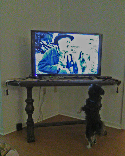 Indy is more and more infatuated with the TV, especially if there is a dog or a horse on the screen. This was an episode of Gunsmoke (I think), and it was in Black and White...she still went over and stood up to watch it. You can see her eyes are glued on the dog. Sometimes when the dogs or horses move off screen (left or right) she will chase them just to find that they have disappeared. She still watches the "other dog" in the mirror. Caught her last night laying in front of one of the mirrors in our living room, just staring at the dog which was staring back at her. Must have laid there for 3 or 4 minutes just staring.